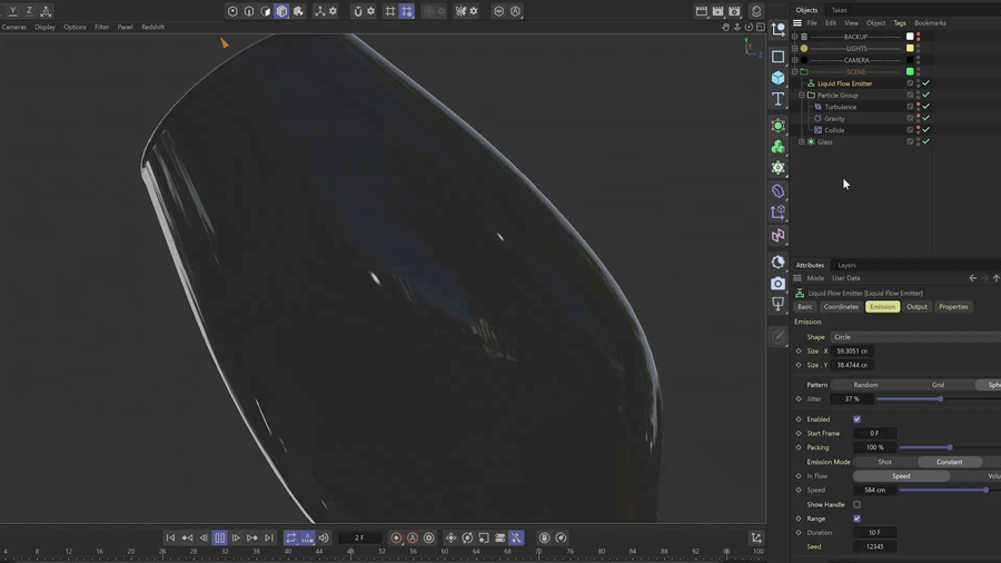 流体シミュレーションのセットアップがこれまでになく簡単になりました。連続的な液体の流れに特化した専用エミッターにより、噴水、水道、ホースなどの液体効果に最適な、途切れのない滑らかなフローを実現できます。 新しい放出アルゴリズムにより、不要な飛び散りや液体の流れに生じる隙間を防ぐことができます。