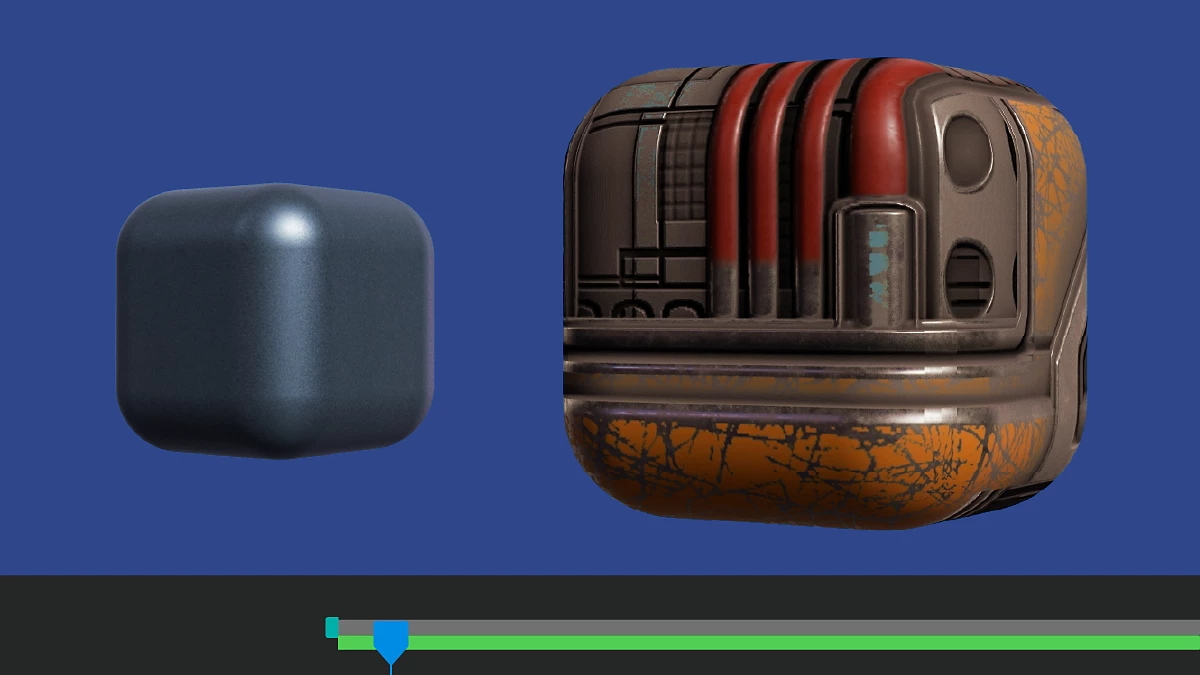 3D モデルとパラメトリックメッシュに Substance マテリアル(.sbsar ファイル)を適用して、幅広いビジュアルスタイルを探索し、スタイライズされた外観を実現できます。