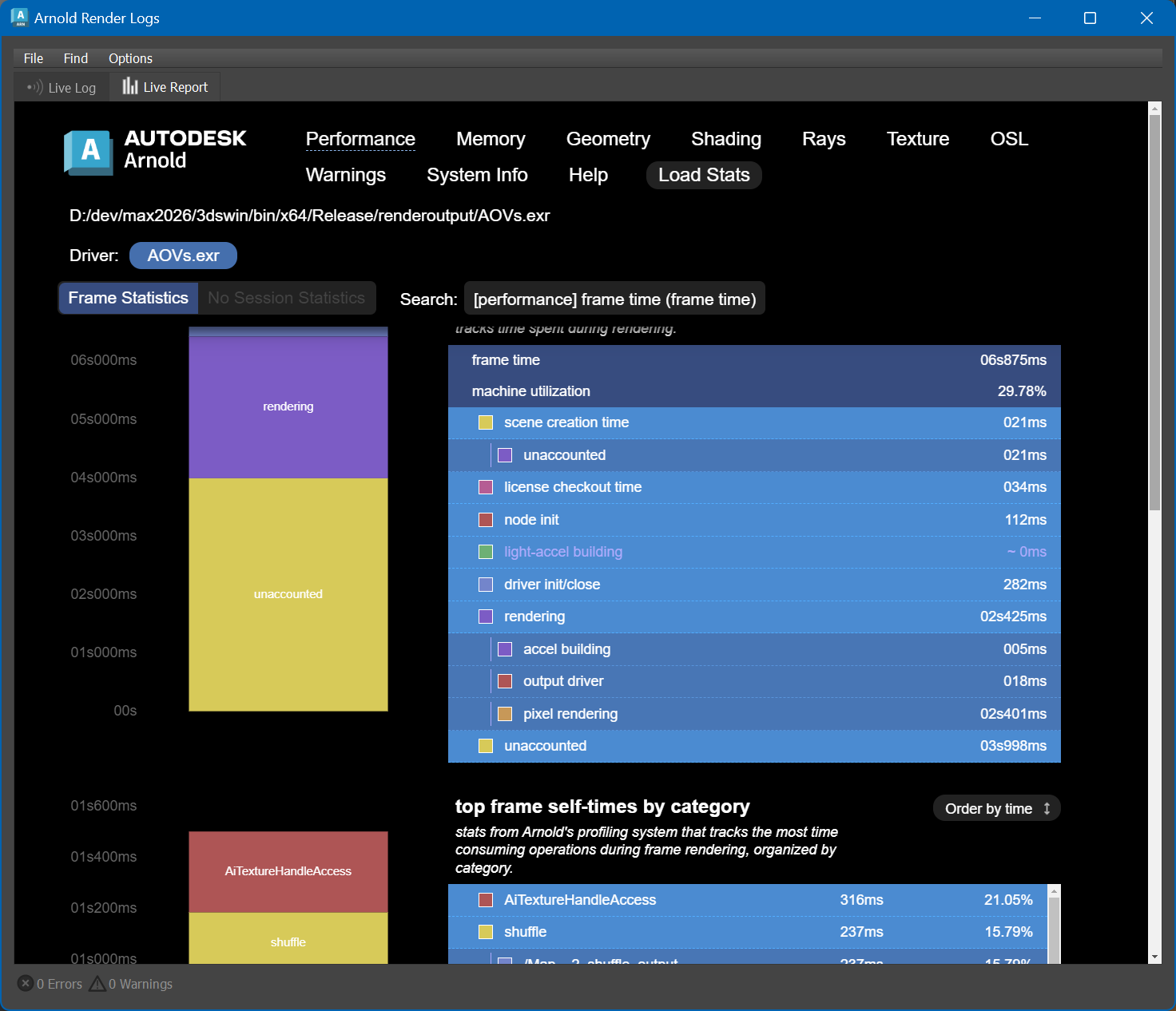 Arnold RenderView に Live Report タブ追加:ログと統計のインタラクティブ表示。レンダリング更新に応じてリアルタイム更新。